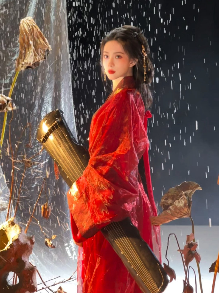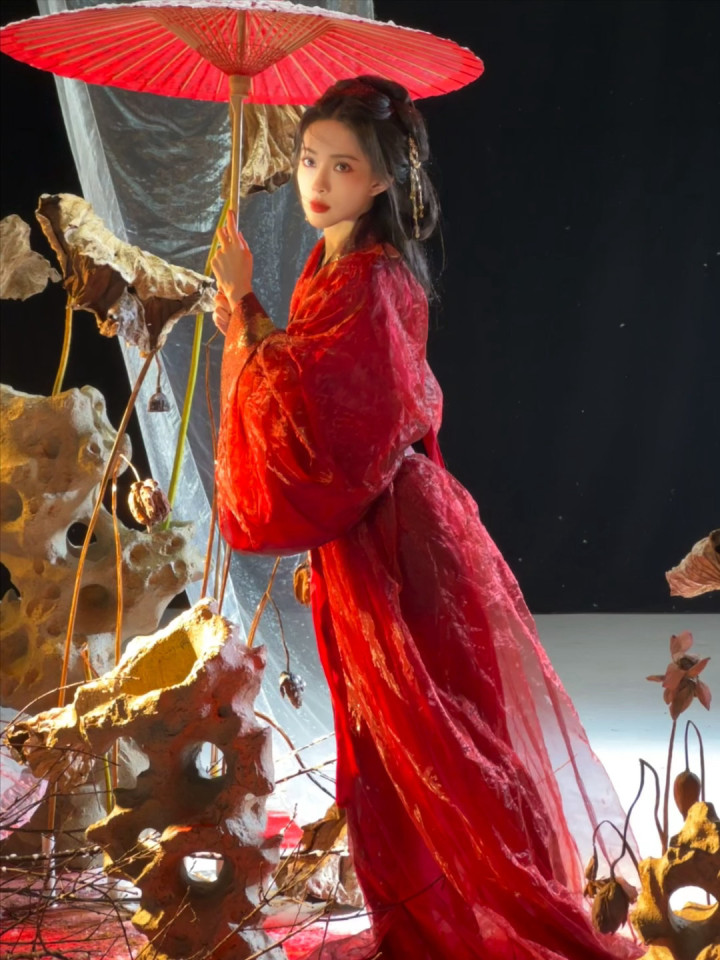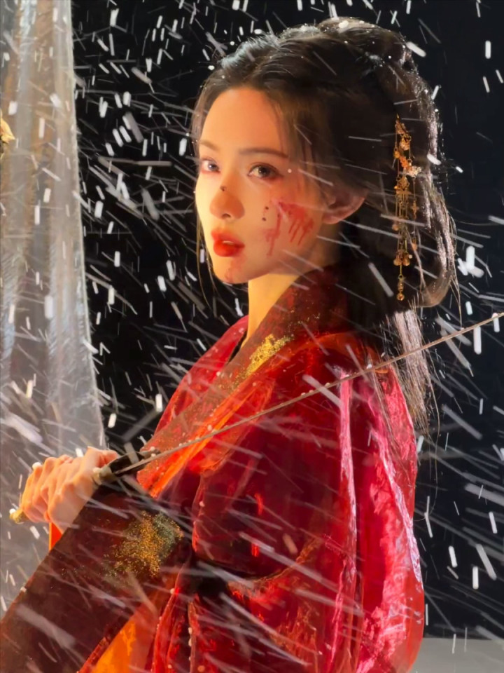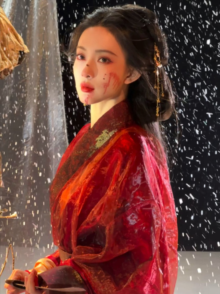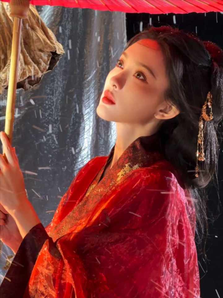 红妆纸伞勾魂夜! 孟子义宽袖盈风踏石径, 发饰点翠美成诗词里的谪仙
