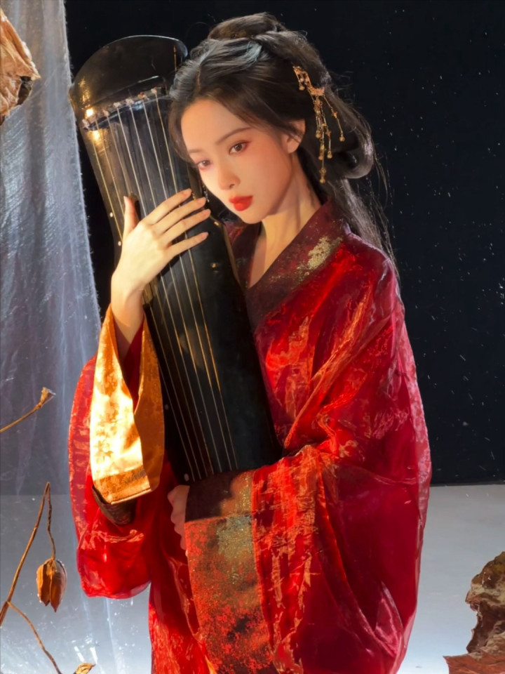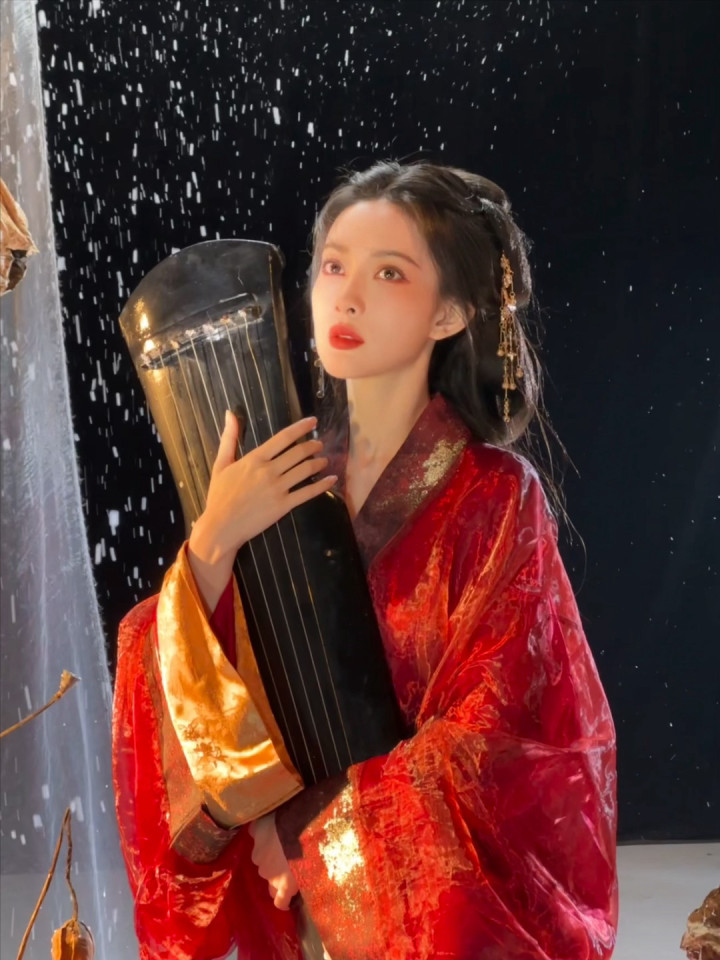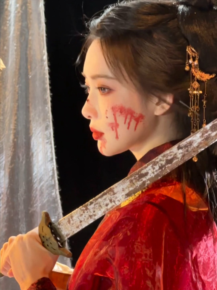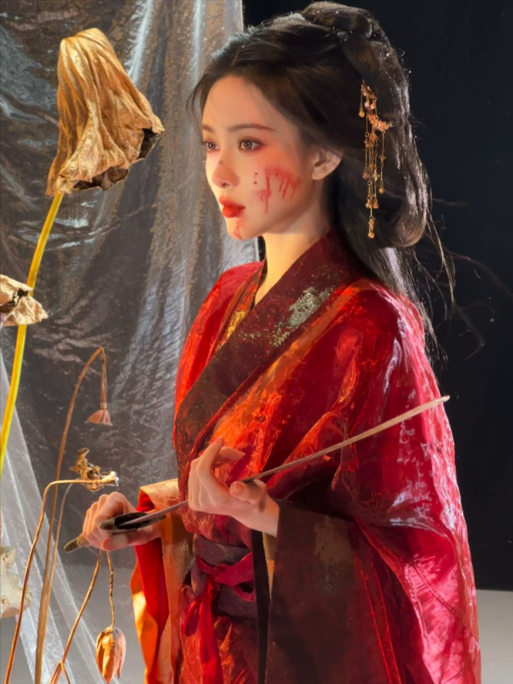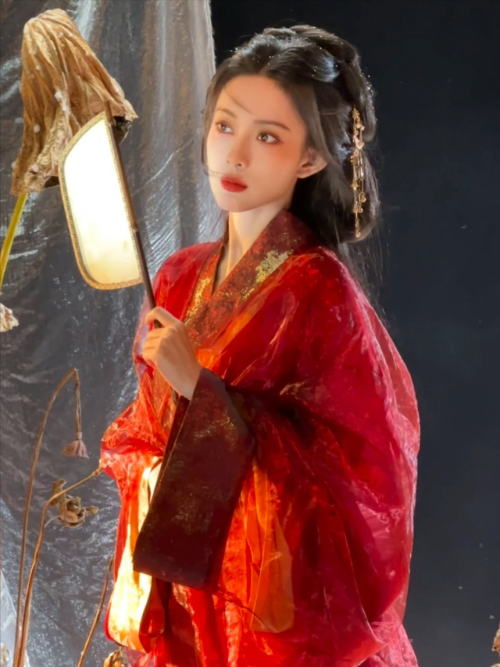红妆纸伞勾魂夜! 孟子义宽袖盈风踏石径, 发饰点翠美成诗词里的谪仙