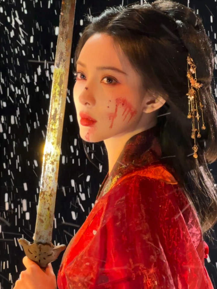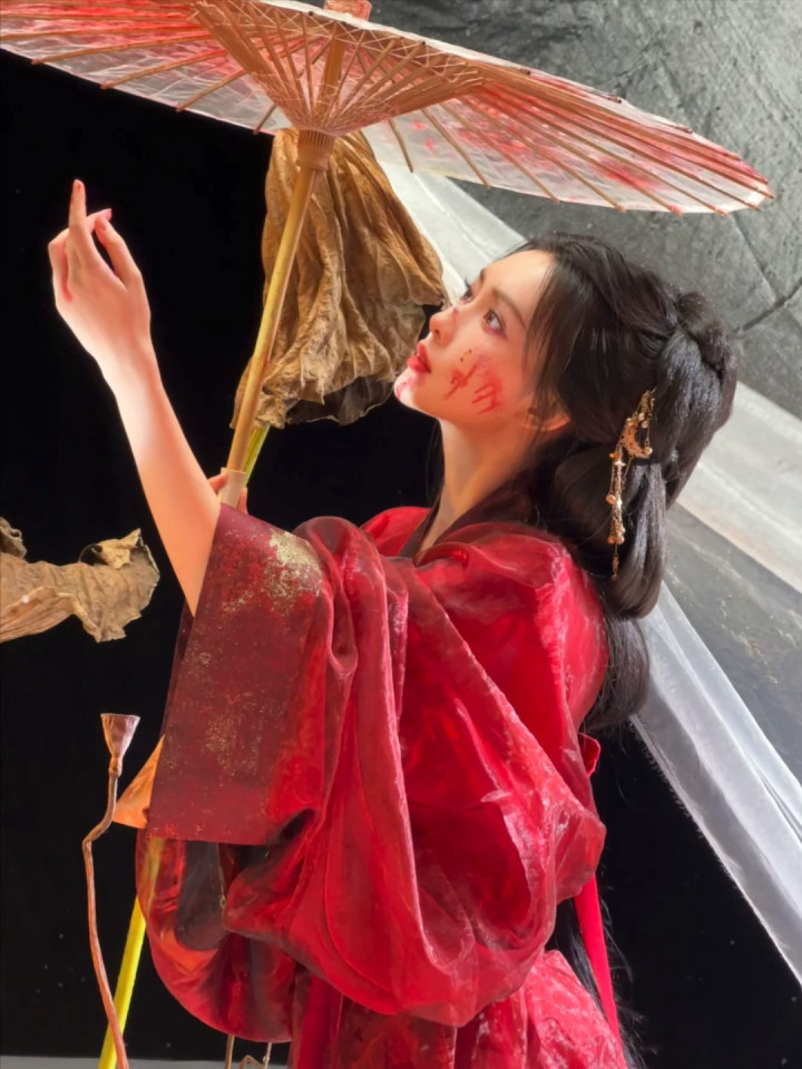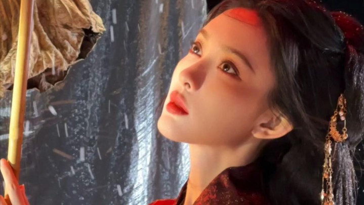红妆纸伞勾魂夜!孟子义宽袖盈风踏石径,发饰点翠美成诗词里的谪仙